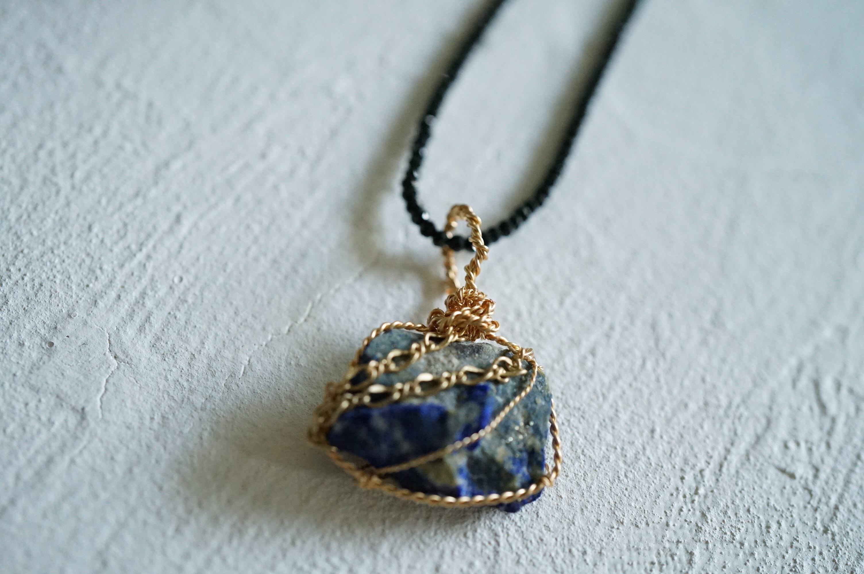 ラピスラズリの原石を、銀色のワイヤーでペンダントトップにしました。