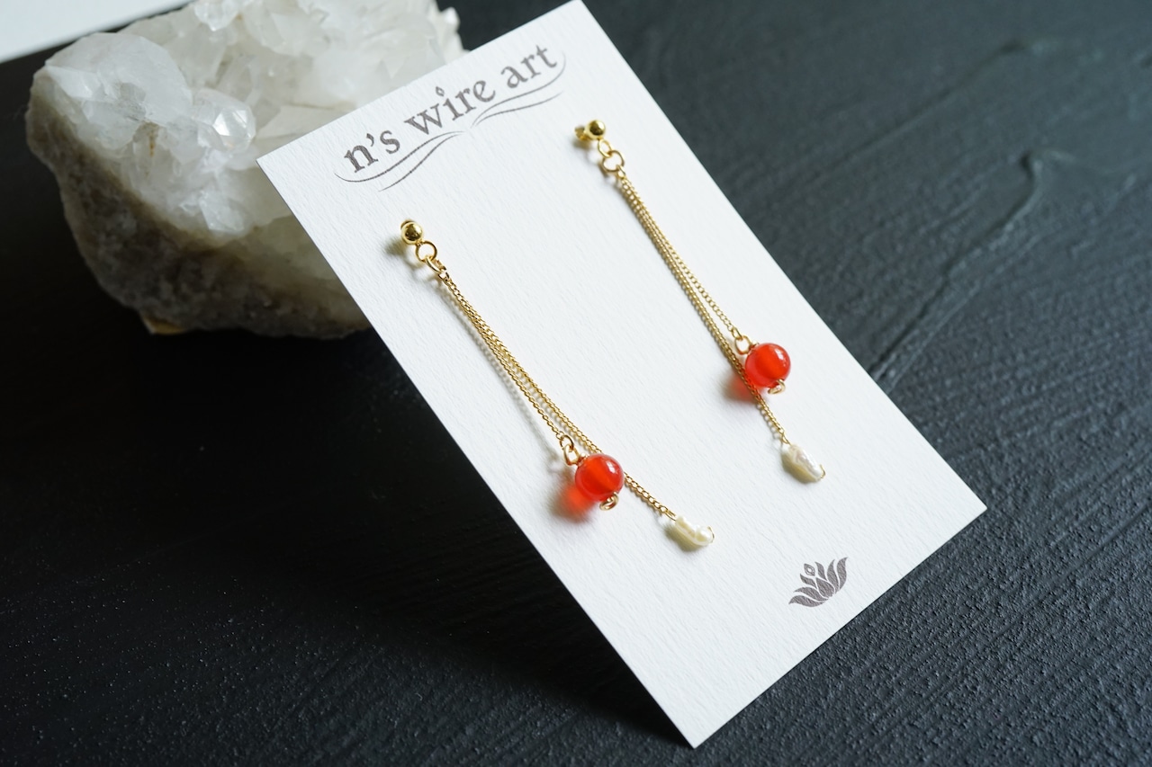 カーネリアンと淡水パールを使用した、幻想的で優雅なピアス/イヤリングです。カーネリアンの温かみのあるオレンジ色が、淡水パールの繊細な光沢と絶妙に調和し、耳元でゆらゆらと揺れます。シンプルでありながらも華やかさを加えてくれるアイテムで、特別な日だけでなく、日常のコーディネートにもぴったりマッチします。