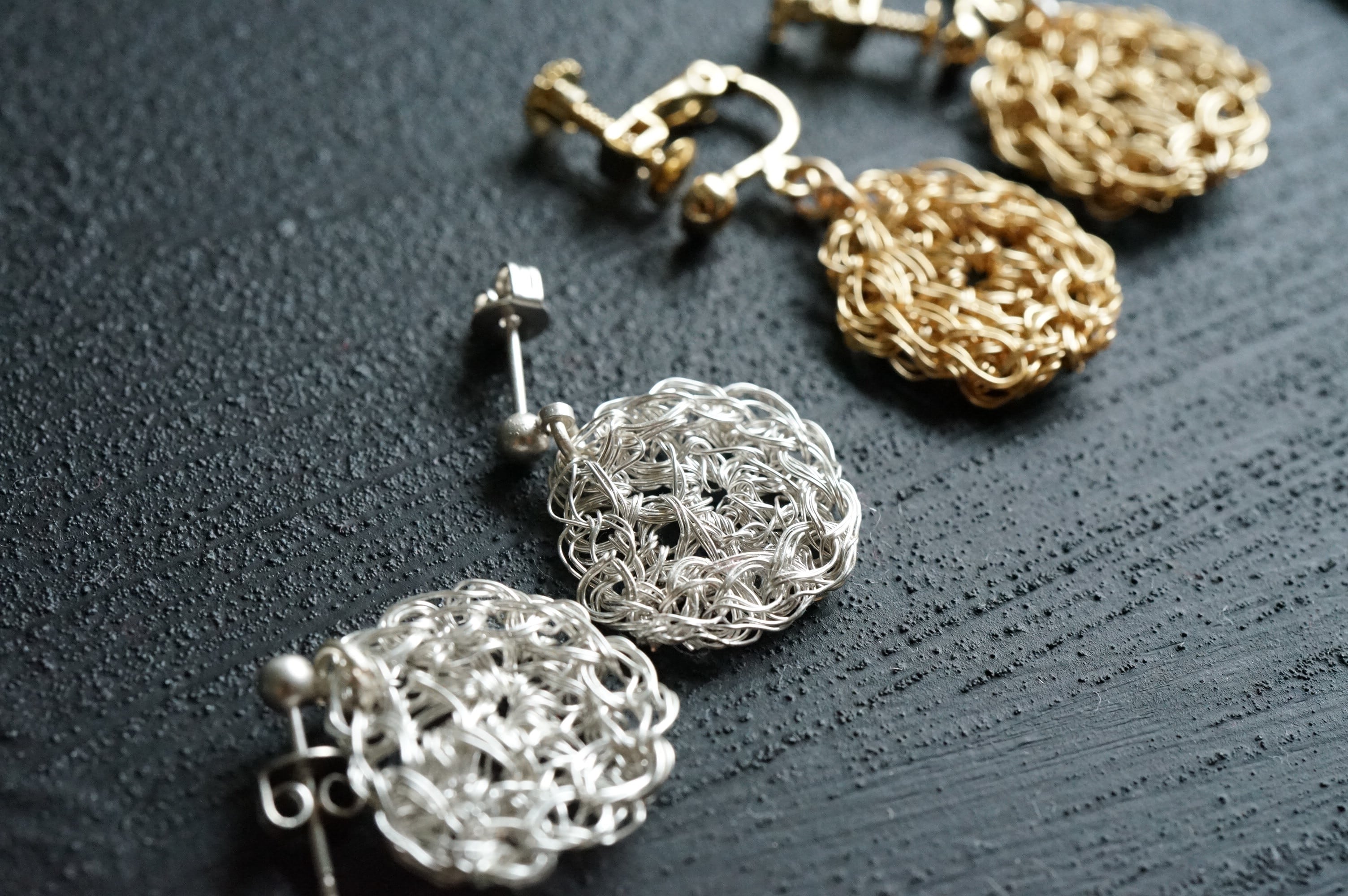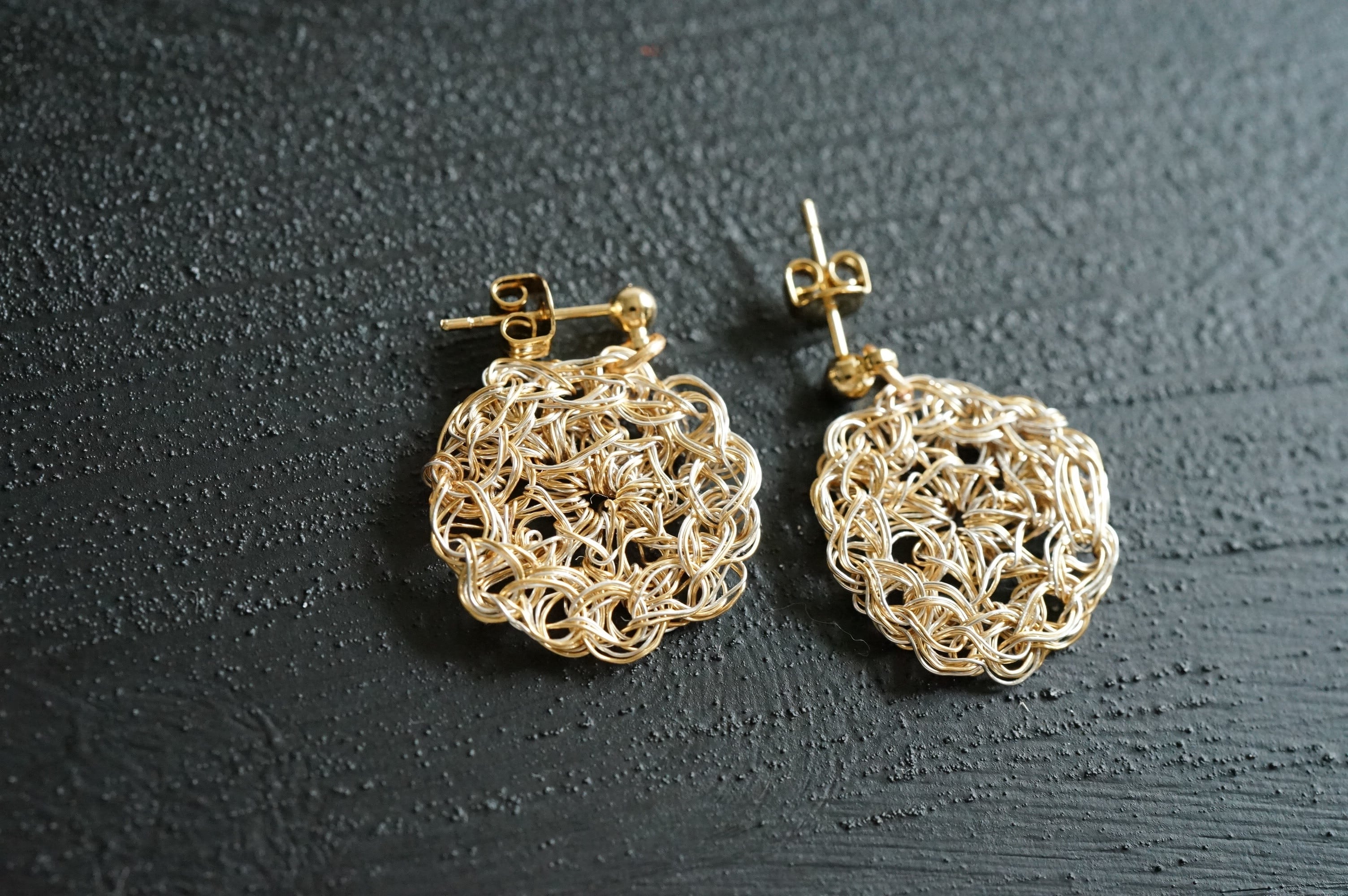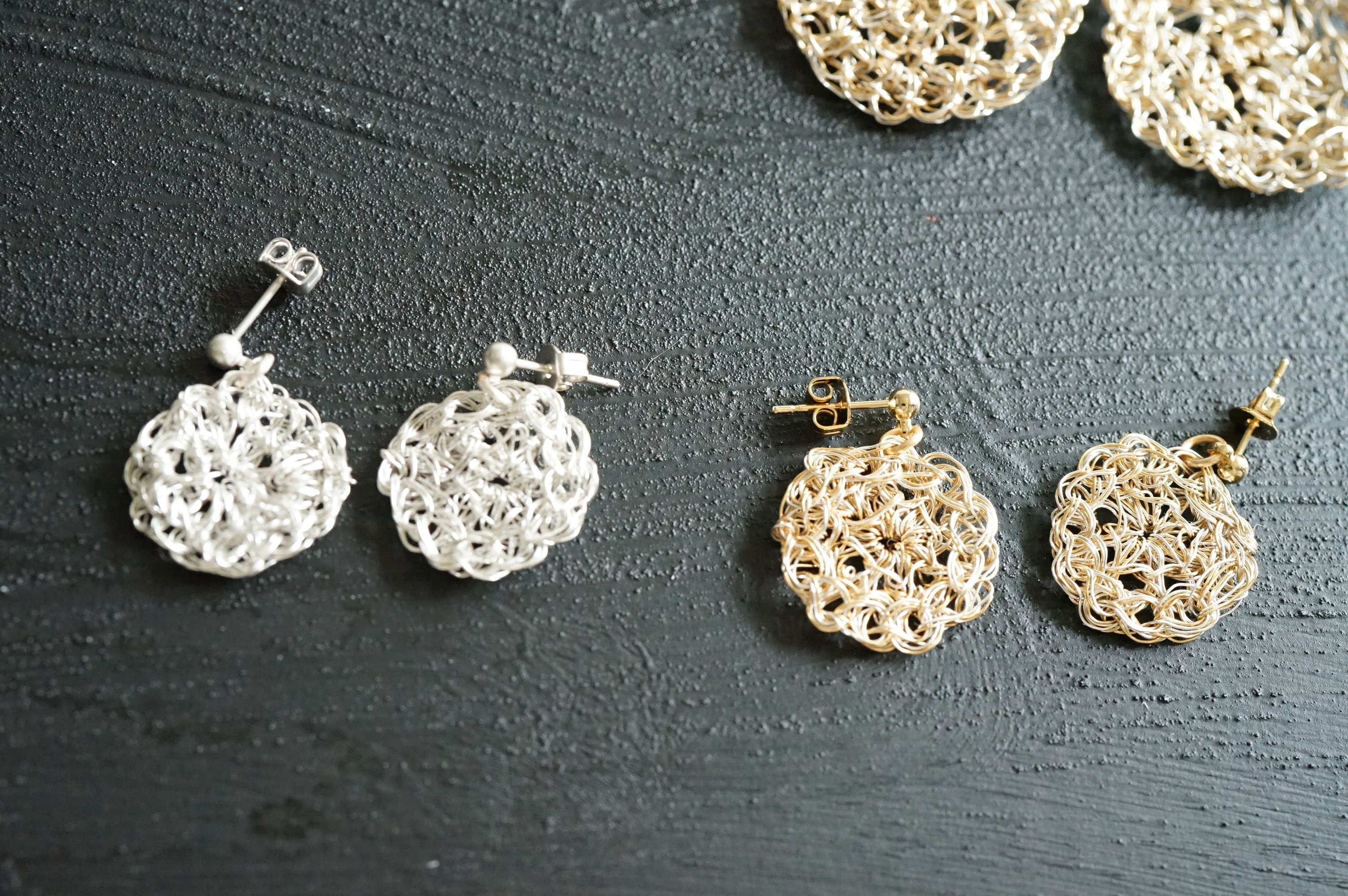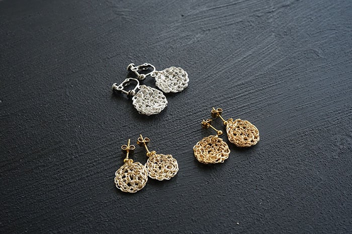 ちいさなラウンドのワイヤーアートをモチーフにして、ピアスに仕立てました。
