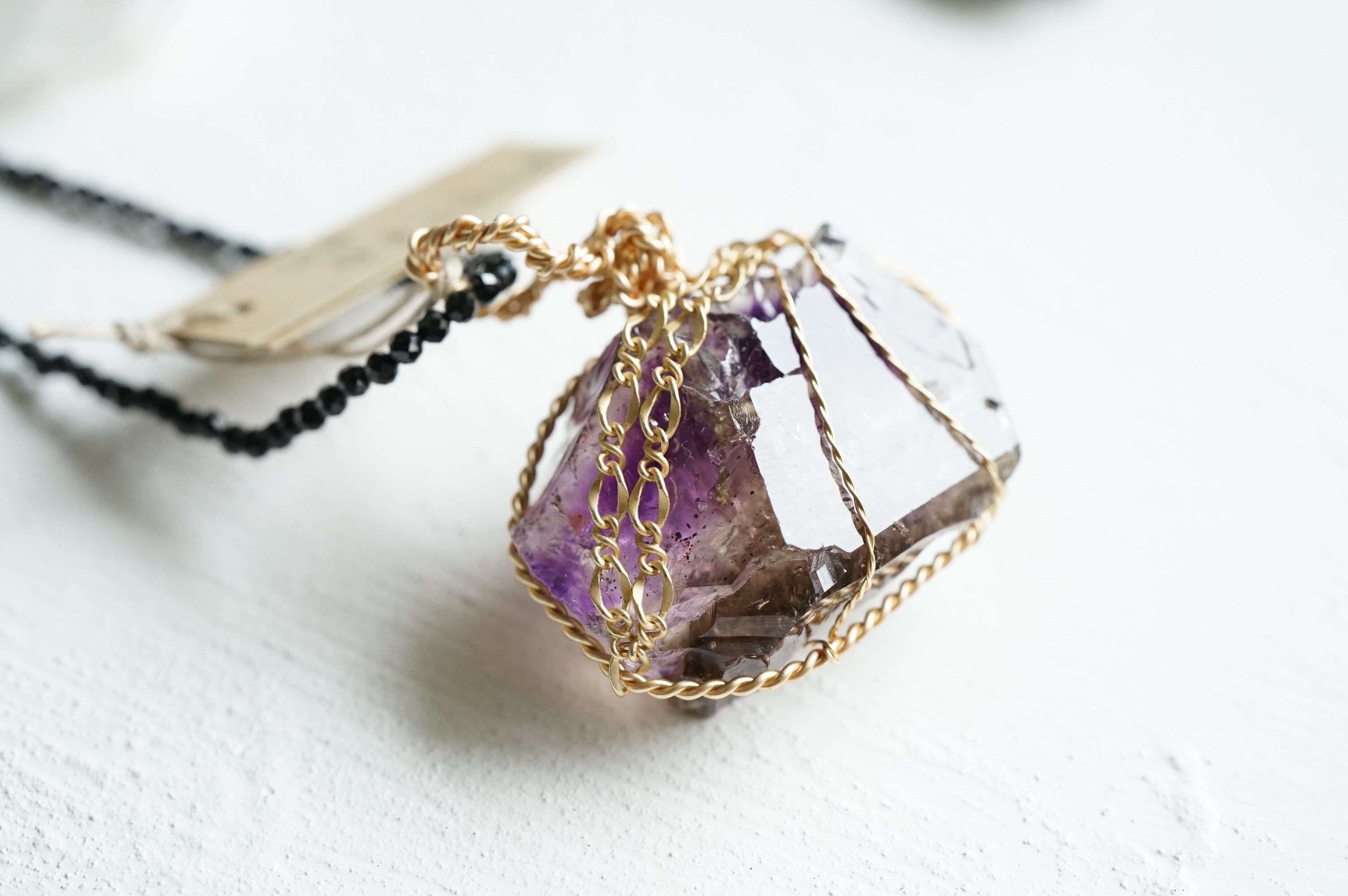 美しいエレスチャルアメシスト原石にチェーンをあしらって、ペンダントトップに仕立てました。