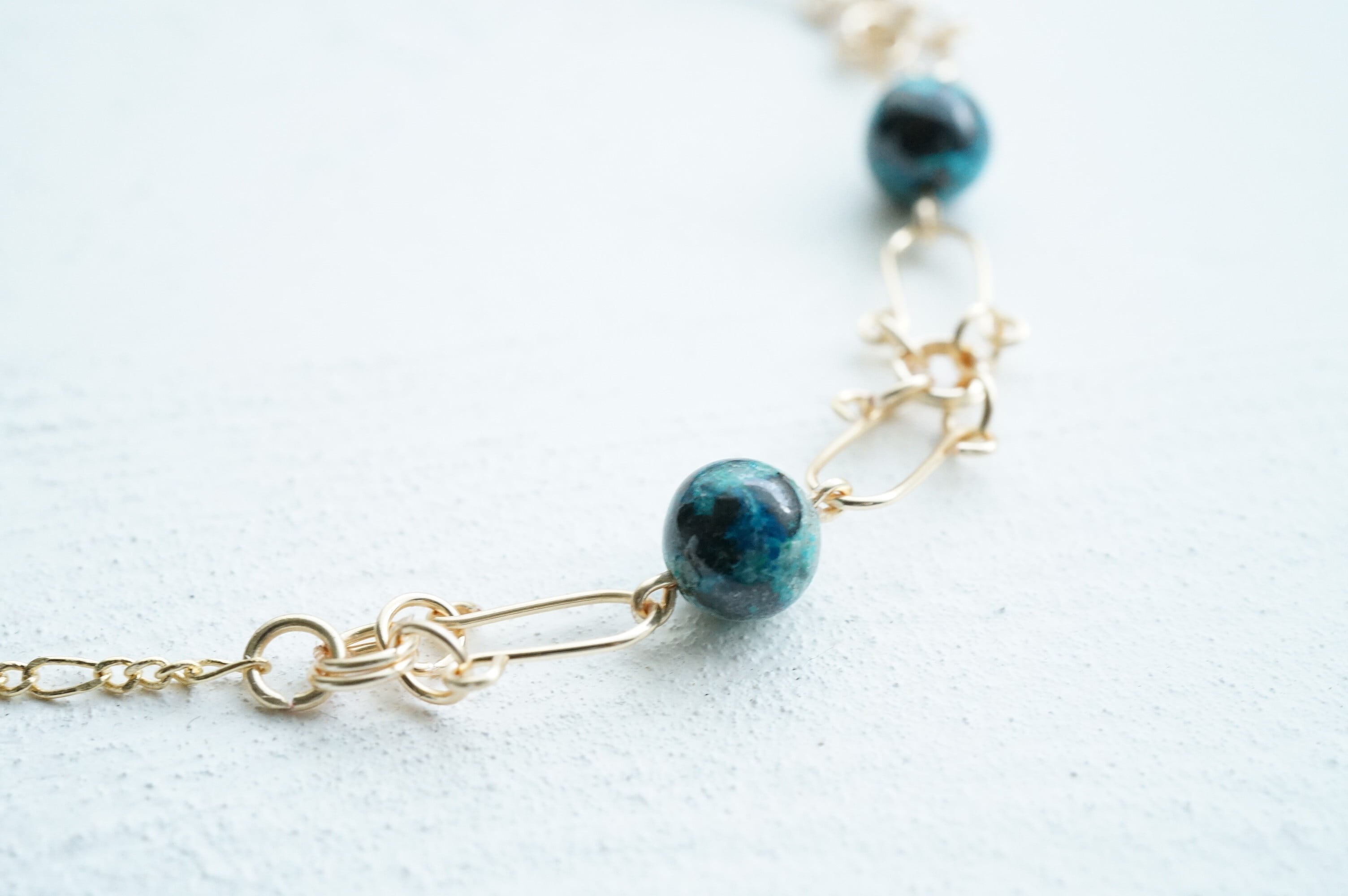 上質なコンゴ産クリソコラの丸玉とワイヤーアートを組み合わせた上品なネックレスです。