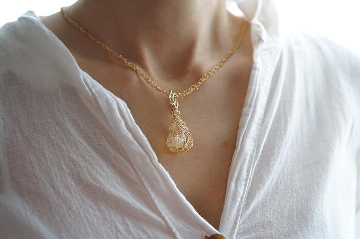 うつくしいシトリンのタンブルを、ワイヤーのレース編みでくるみ、個性的なペンダントトップに仕上げました。