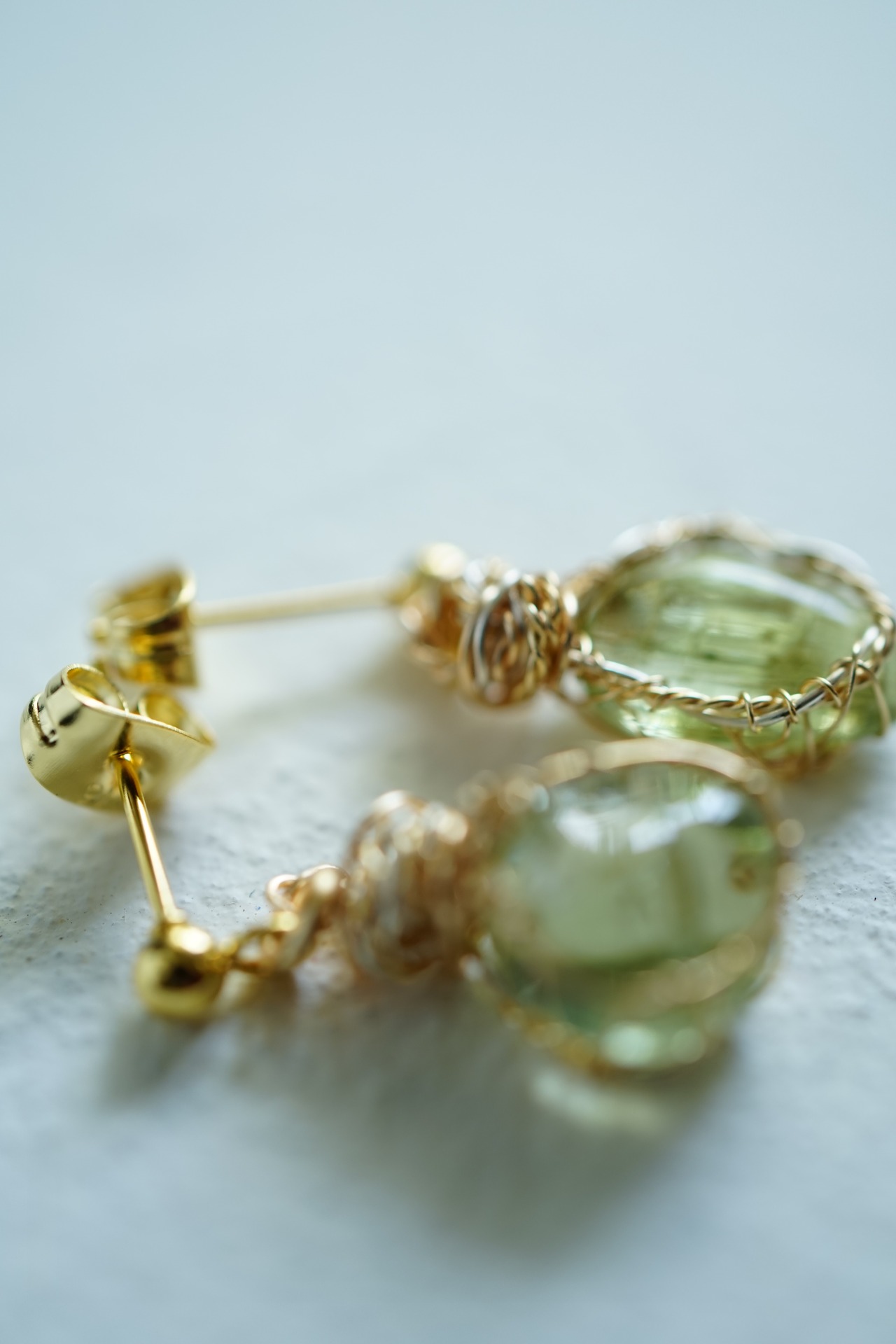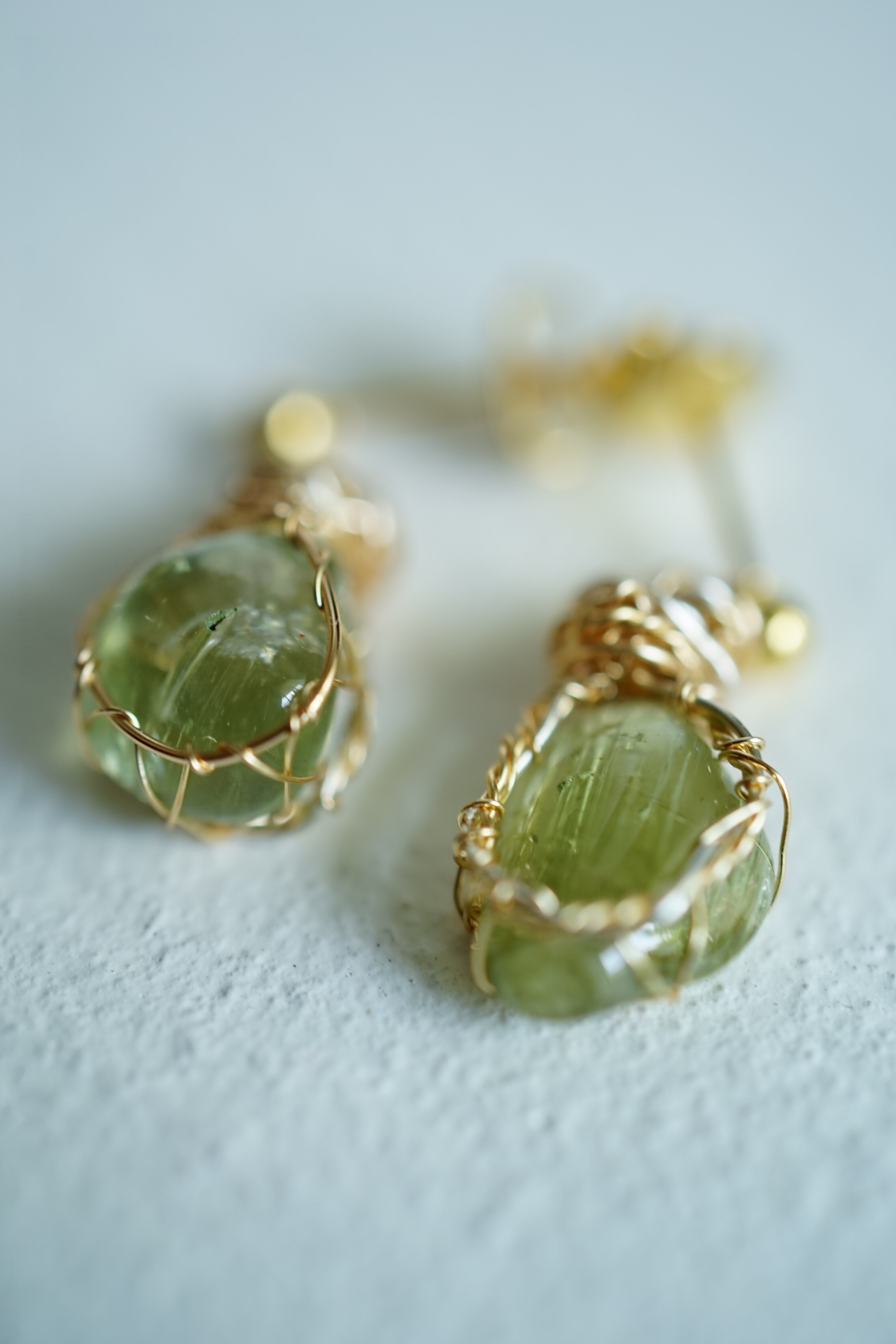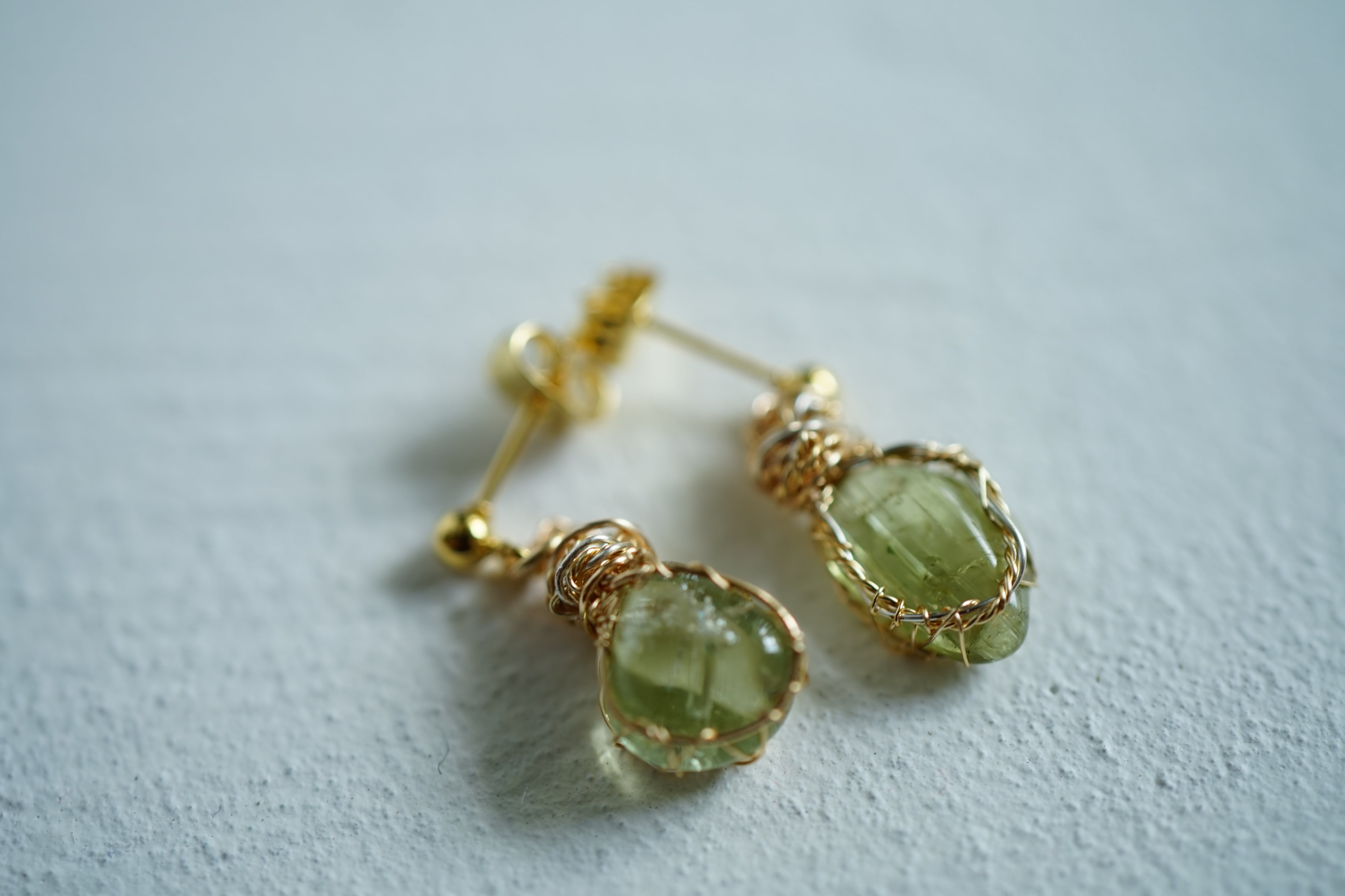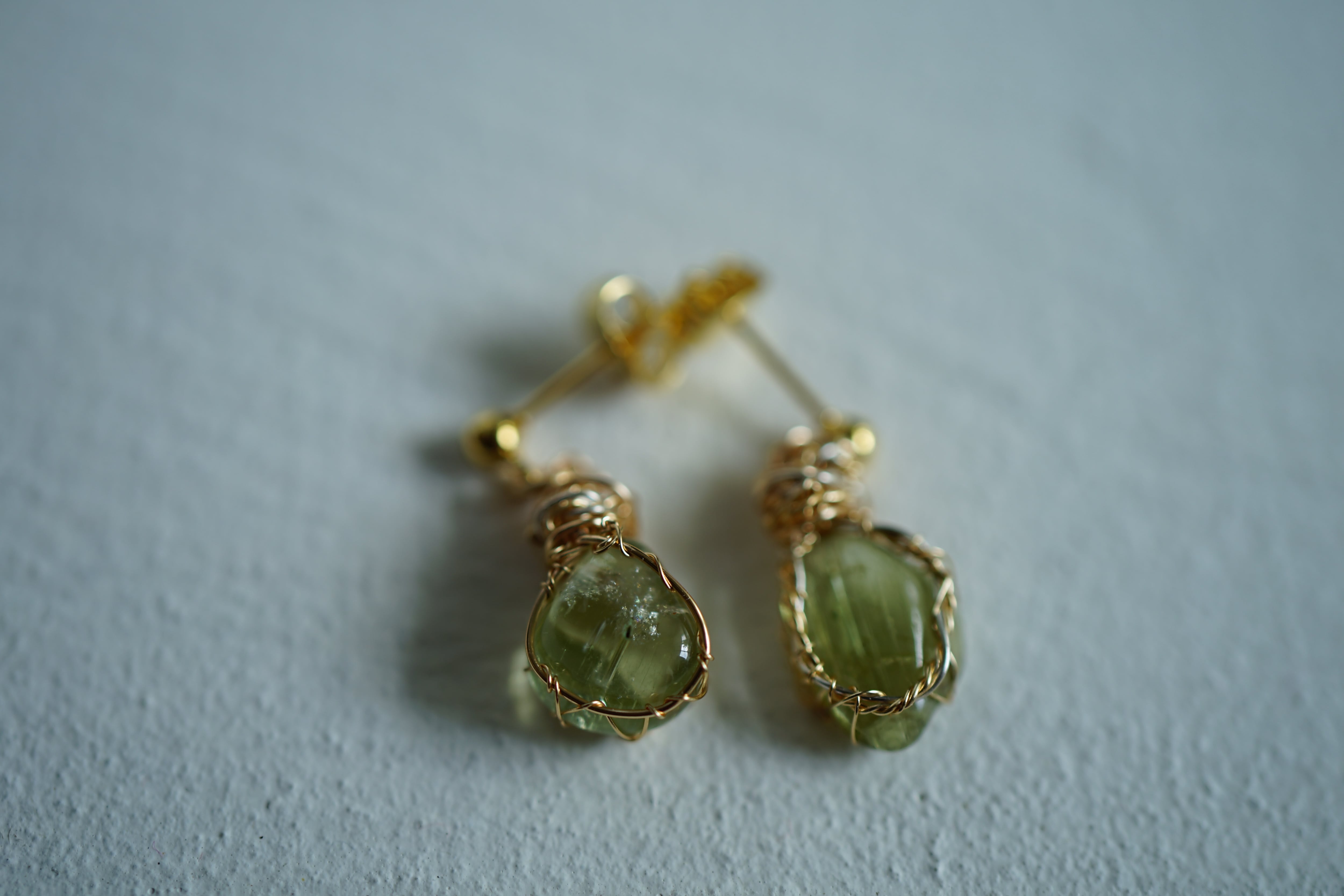 グリーントルマリンはその鮮やかな緑色と透明感が特徴で、心を落ち着かせる効果があると言われています。軽やかで華やかな耳元のアクセントとして、どんなコーディネートにも合わせやすいデザインとなっています。